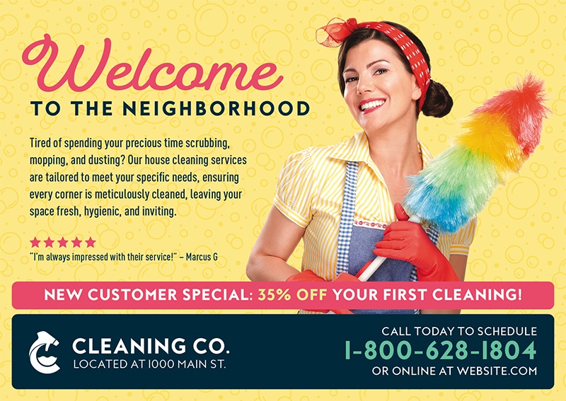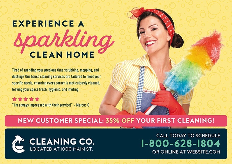 You provide reliable service to your clients. You deserve the same from your marketing. We have worked with hundreds of maids, janitors, and cleaning services professionals, and we have tracked the data from all of those campaigns. Above you’ll find examples of the cards our actual clients have used with spectacular results. You can use any sample design you see for your own business and customize it with your logo. Or, if you prefer, we can design you a brand new card from scratch. Simply use the arrows to scroll through the gallery, and don’t forget to further your marketing education with the amazing resources at the bottom of the page!